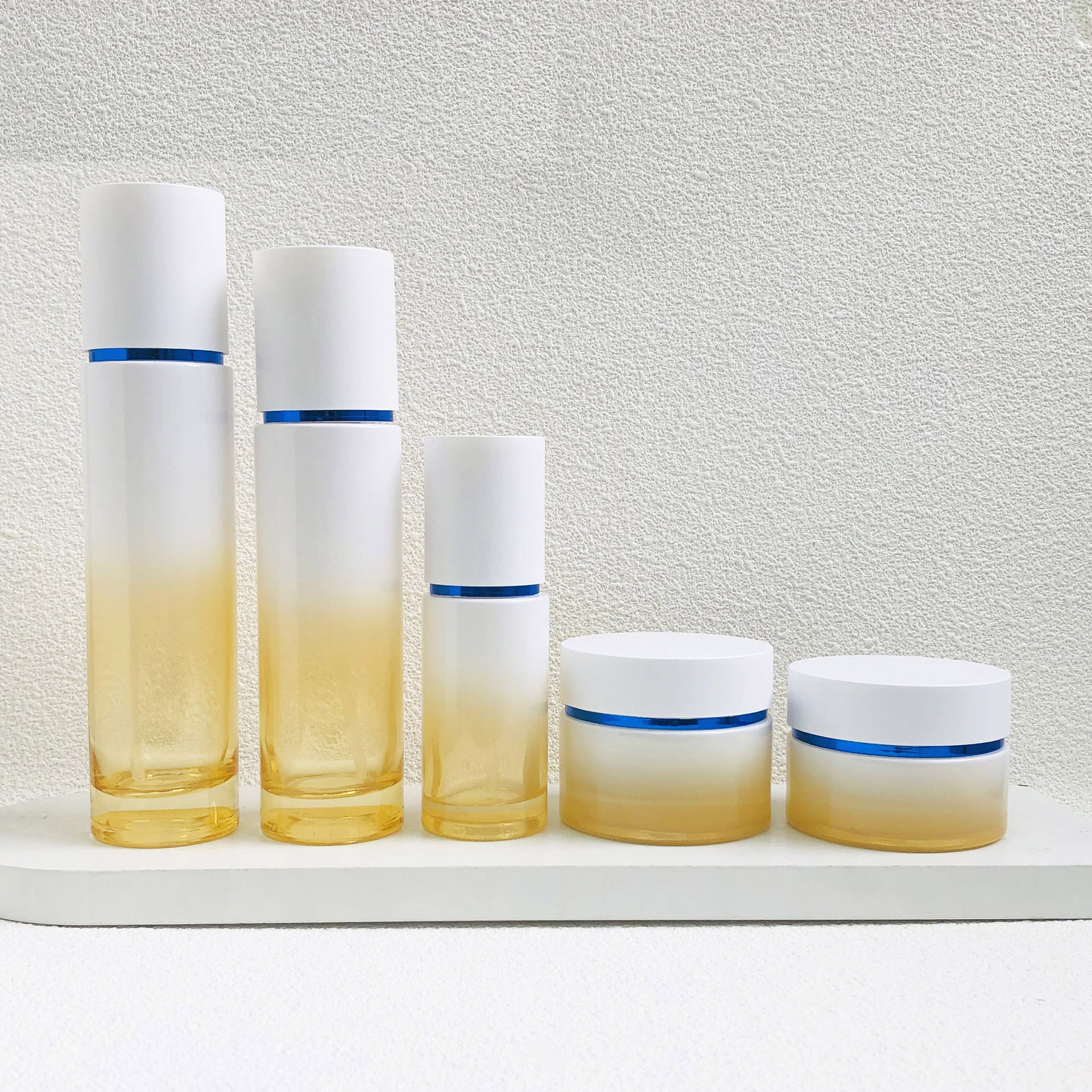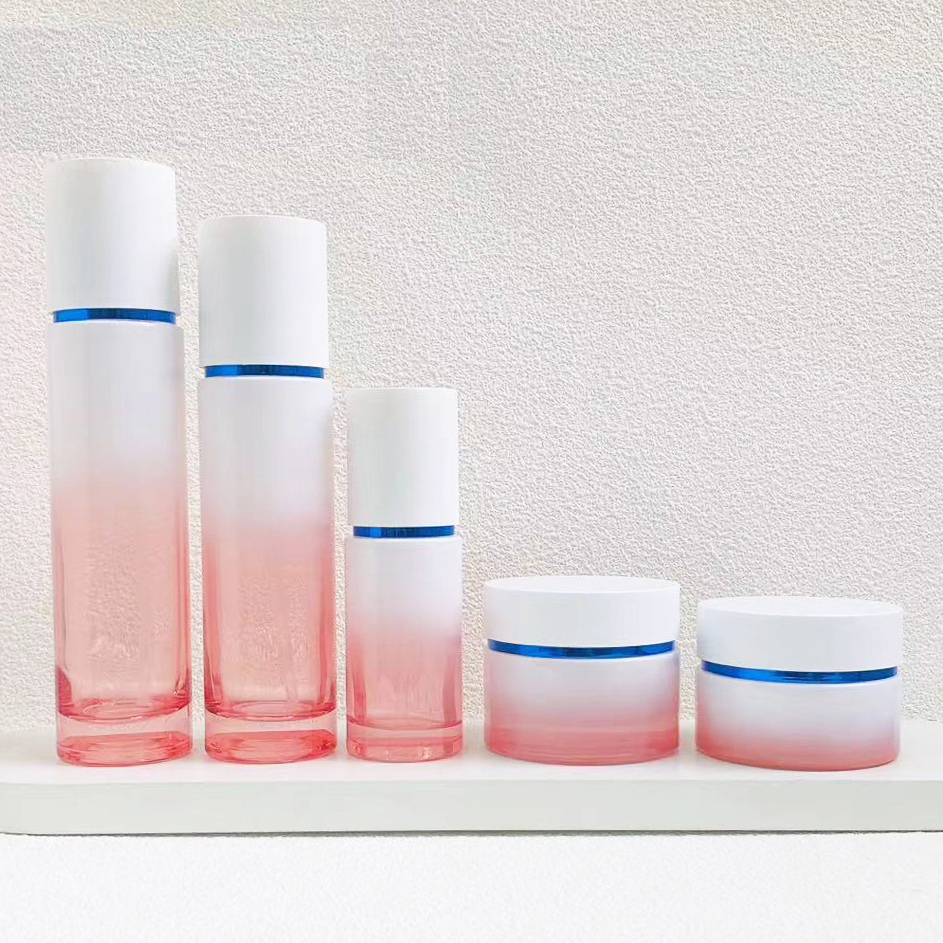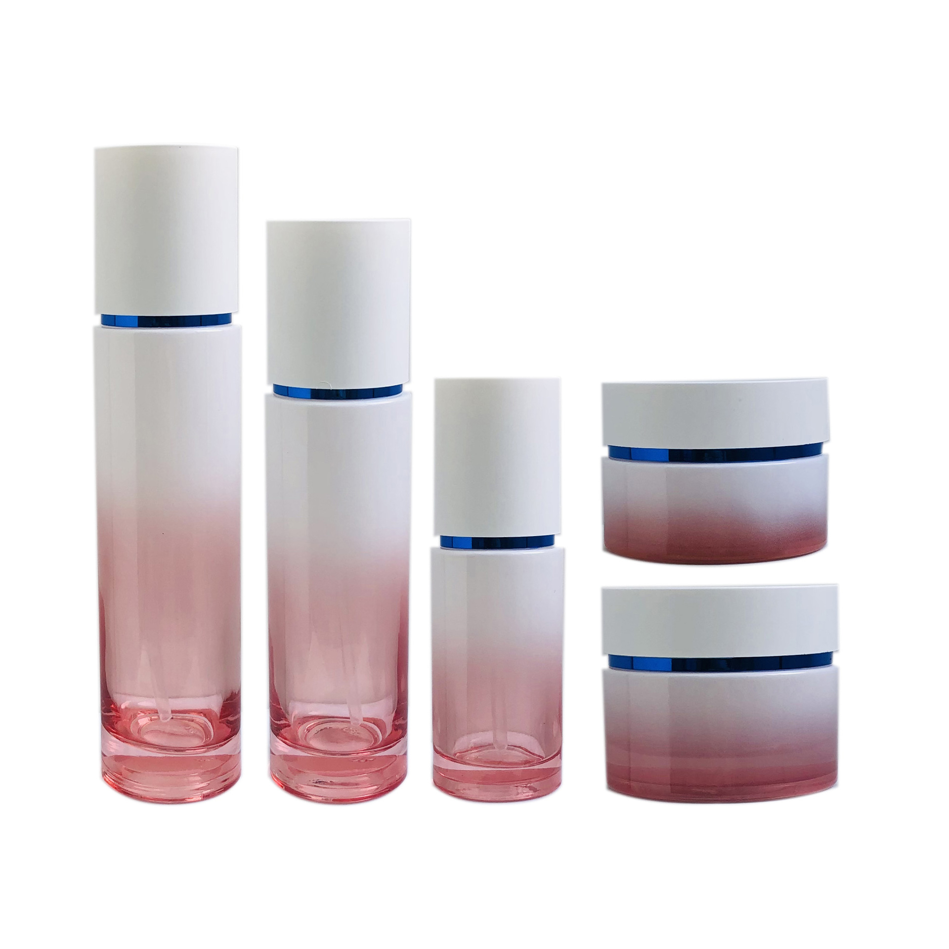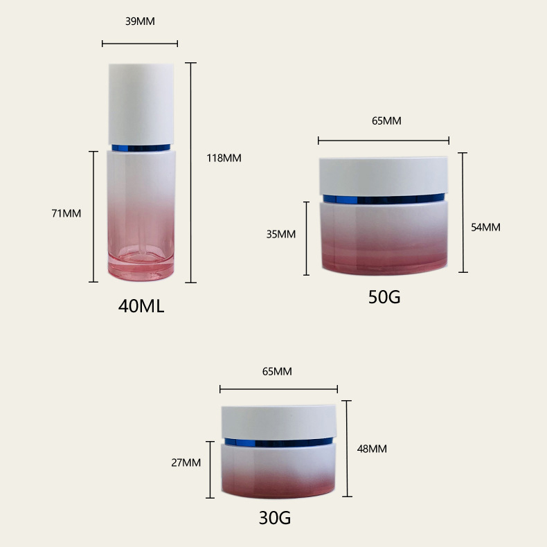 This delux cosmetic glass bottles set features a harmonious combination of glass lotion bottles and glass cream jars, crafted to meet the demands of high-end skincare packaging. The soft gradient glass finish enhances shelf appeal while maintaining a clean, modern luxury aesthetic.