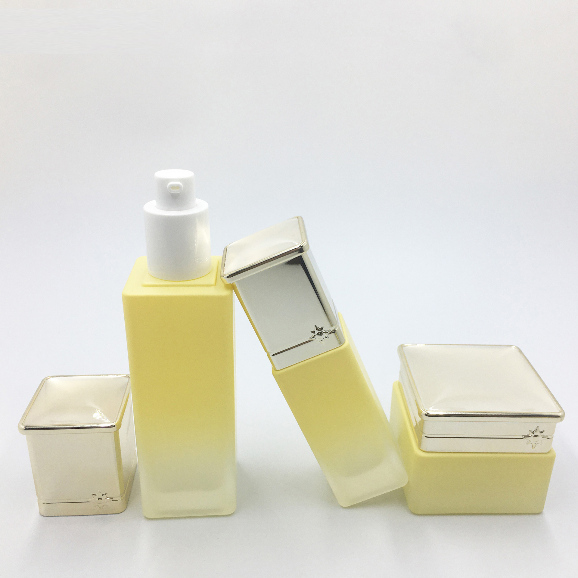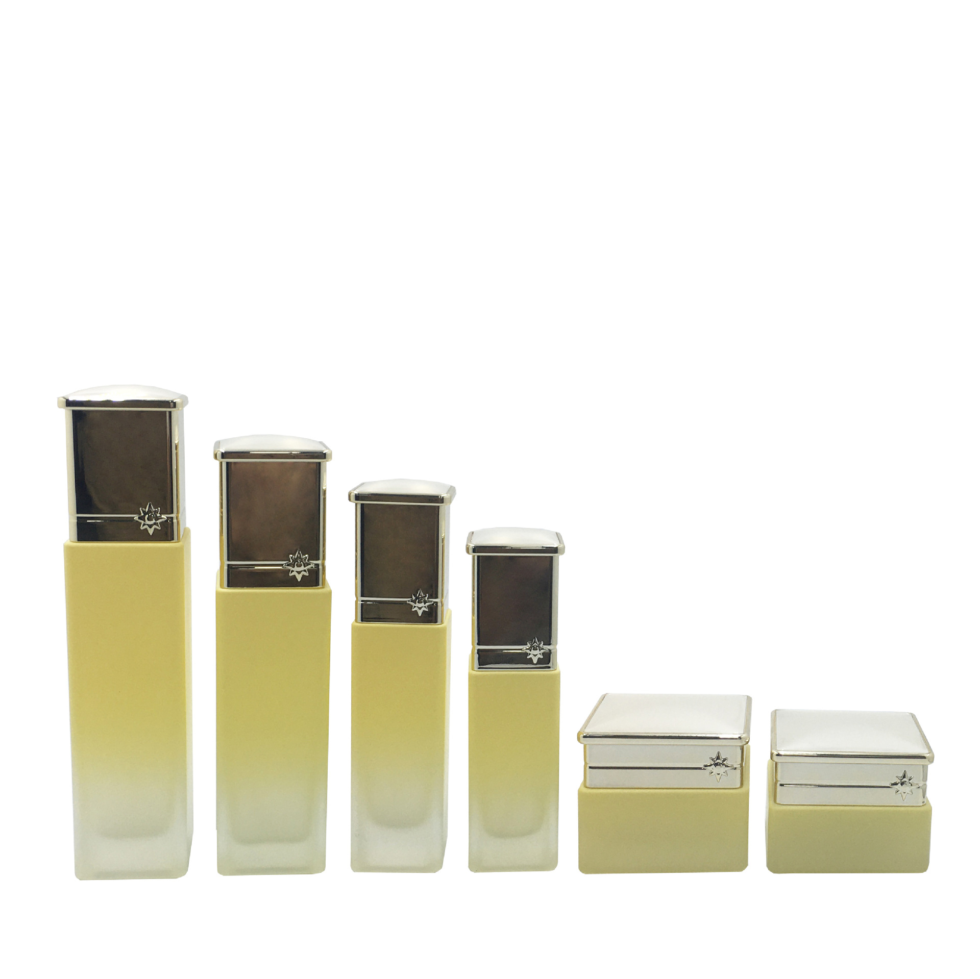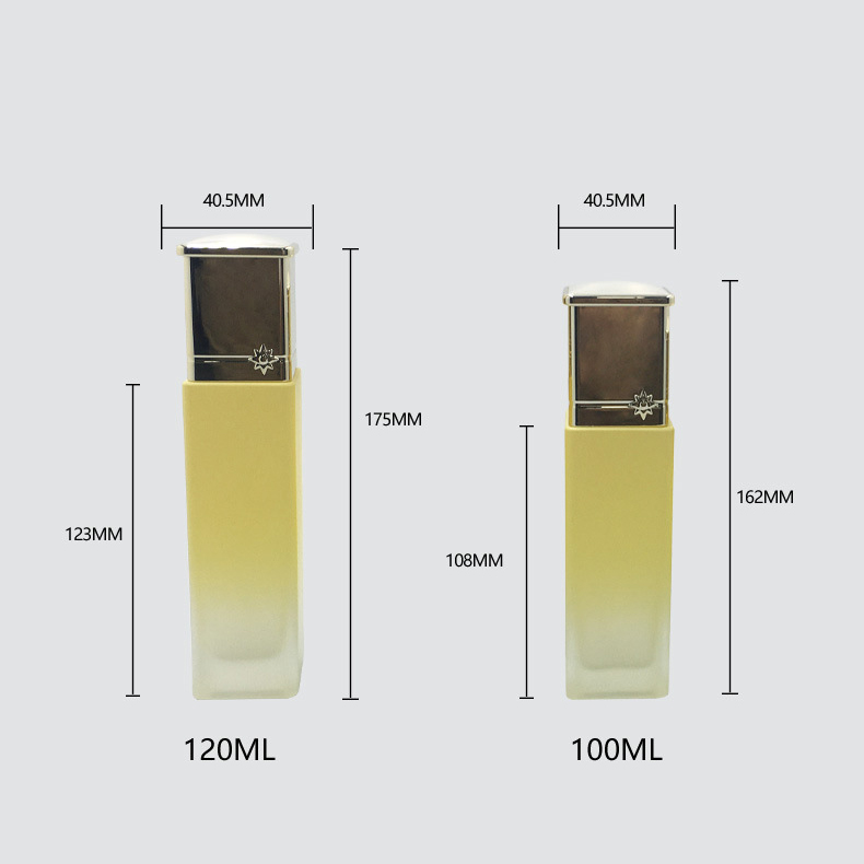 Our glass rectangle bottle series features a sharp, modern rectangular silhouette combined with a soft frosted gradient finish and luxury metallic caps.